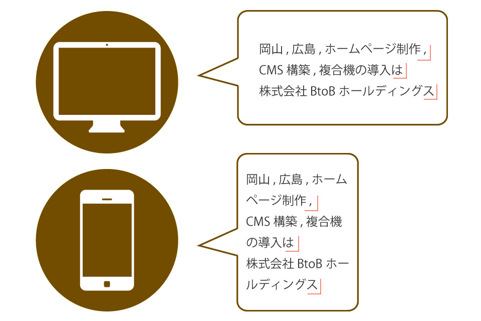 パソコンだと画面が大きいので綺麗に改行したものが表示されますが、スマホになると画面の大きさが小さくなるので赤い印以外のところでも改行が発生してしまうのです。